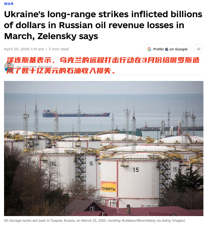 乌总统泽连斯基在4月19日的晚间讲话中也摊牌了:乌克兰的远程打击正在精准削减俄罗斯最主要的战争资金来源。根据乌方统计,仅在3月份针对俄石油基础设施的打击就造成了俄至少23亿美元的石油收入损失。